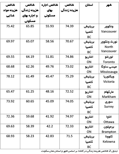 طبق این شاخص، هزینه های مختلف زندگی در کانادا به شرح زیر است: